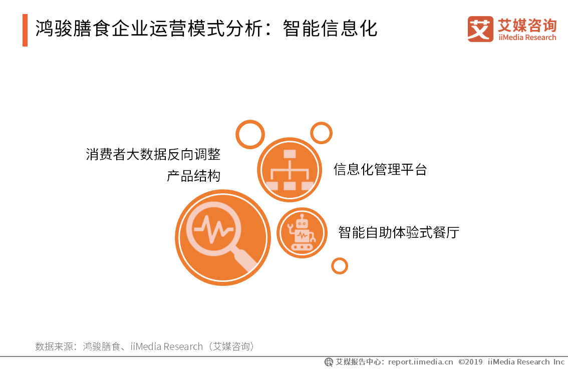 鸿骏对标全国各地经典菜系,研发1000道标准化菜单、6大系列产品,并根据消费者大数据对产品结构进行不断调整。应用大健康智能管理的理念,鸿骏创建智能自助体验式餐厅,通过智能生产、智能物联、智能销售、互联网支付,实现食物安全、科学、营养和标准化,就餐者可通过手机实时查询餐厅菜谱、消费记录及营养摄入分析,实现智能化健康管理。此外,在管理方面,鸿骏应用信息化系统平台,实现物流管理、人力资源管理、供应链管理、菜单管理四大模块标准化运作。