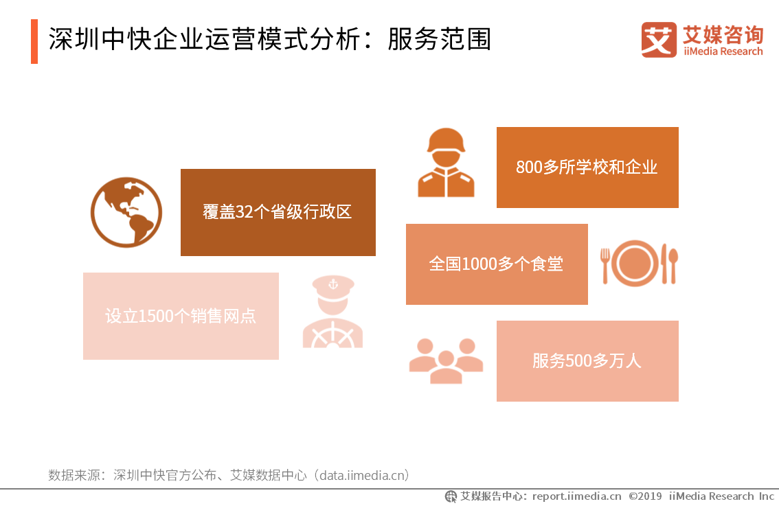 深圳中快与多家企业达成合作,在全国有超过1500个销售网点,覆盖32个省级行政区。其服务对象包括清华大学、北京师范大学、天津大学、复旦大学、浙江理工大学、香港中文大学、中国科学技术大学等,截至2019年上半年,深圳中快已承包托管全国800多所学校与企业的1000多个食堂,每天为500多万人次提供用餐服务。