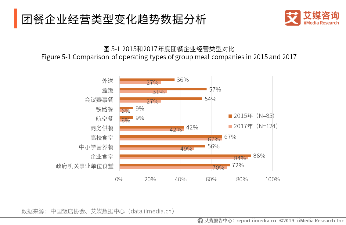 在盒饭和会议赛事餐的经营方面,2017年团餐市场较2015年有非常明显的下降,而铁路餐、航空餐、外送、中小学营养餐以及企业和政府机关事业单位食堂的经营略微有所下降,商务供餐和高校食堂的经营比例与2015年度持平。艾媒咨询分析师认为,由于团餐市场日趋成熟,各个团餐企业的经营类型趋于稳定,有侧重点的多元化发展是团餐企业能够长期发展的重要影响因素之一。