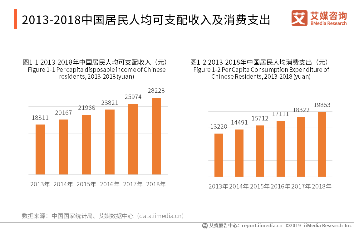 2013-2018年,随着国民经济稳步发展,中国居民人均可支配收入不断上涨,催生出更强烈的社会消费需求,居民消费信心不断增强。至2018年,中国居民人均可支配收入达28228元,人均消费支出达到19853元,占可支配收入的70.4%,消费情况较为乐观。