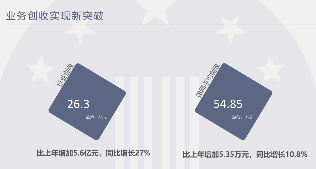 律师行业业务创收首次突破25亿(达26.3亿),比上年增加5.6亿,同比增长27%,执业律师人均创收首次突破50万(达54.85万),律师行业继续保持稳定可持续增长。