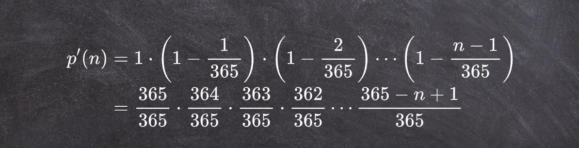 其中 p'(n) 就表示 n 个人中,每个人的生日日期都不同的概率。