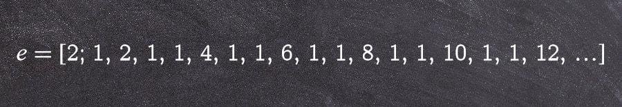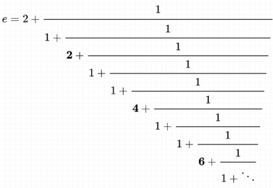 e 的连分数展开式如下所示,请观察里面的规律: