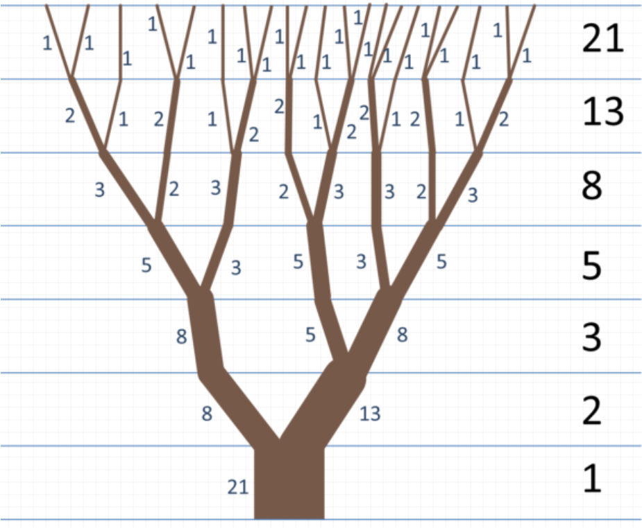 1.618… 与 0.618… 互为倒数,也就是 1.618… 的倒数是 0.618…,0.618… 的倒数是 1.618…,人们称两者为黄金比例共轭。可以有这个式子表示出来:1/ϕ≈1+ϕ它在自然界中广泛存在(就像前面提到的那样)。有些树的生长就是很好的例子,树干先是自由向上生长,长着长着它就拥有了一个分叉,于是产生了 2 个新的起点,其中一个起点会长出 2 个是新的分叉起点,而另一个则不会。这个模式这个规律就好像是斐波那契数列一样。