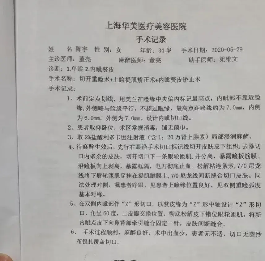 仔细回忆手术过程,陈宇觉得,右眼的手术时间要比左眼长得多,而且进展好像不太顺利。在做完右眼的双眼皮和提肌手术,接下来要开眼角时,她听到董亮嘟囔了一句,“左右眼睛的内眼角怎么这么不一样?”