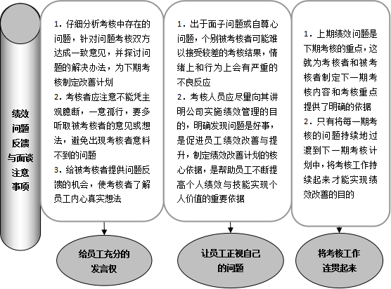 面谈内容主要包括3个方面,即上期考核中发现的绩效问题,考核表现良好的方面和下期考核计划。其中绩效问题是面谈内容的重中之重,在与被考核者沟通反馈绩效问题时应注意以下事项。如图7-2所示。