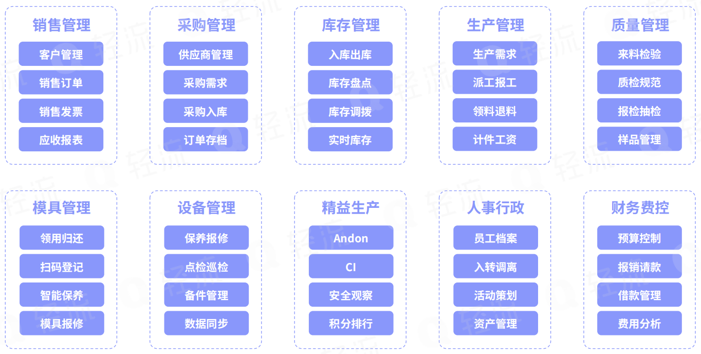 企业数字化转型要从具体的场景逐步入手,制造业也不例外。我们总结了一套制造行业的管理场景覆盖采购、生产、销售、库存、财务等多方面。