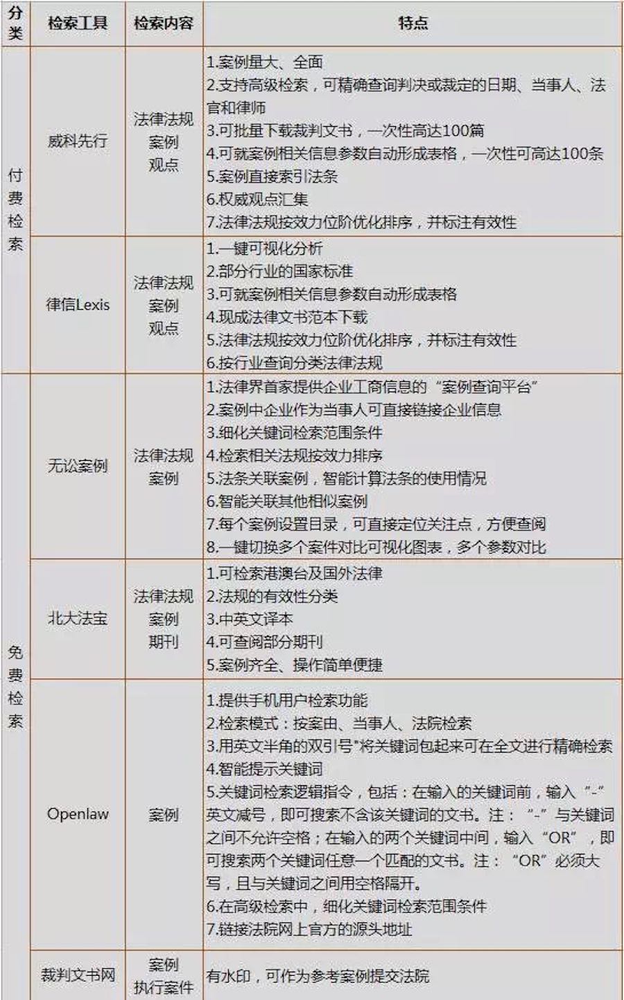 常言道,工欲善其事必先利其器,是否能够选择适合的法律检索工具是决定法律检索质量的关键点。常用的检索工具主要分为付费与免费两大类,包括:
