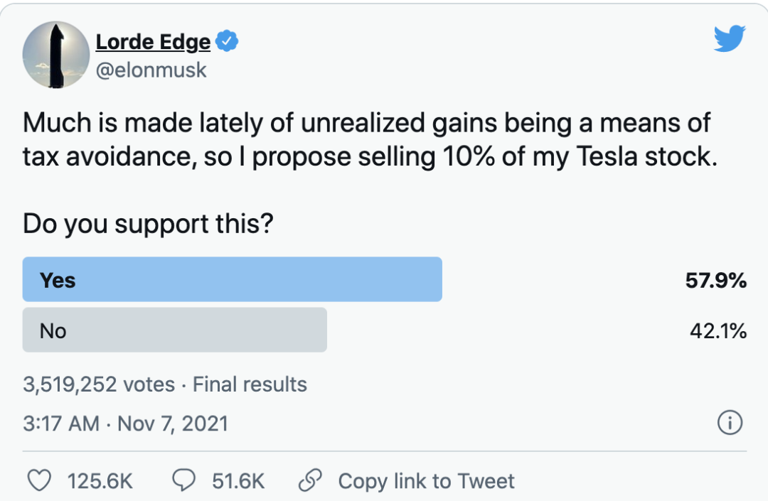 上周末,特斯拉首席执行官马斯克在推特上向他的6270万粉丝“征询意见”,主题是他是否应该出售10%的特斯拉股份。他在推文中写道,“近期许多人认为未实现的收益是一种避税手段,所以我提议卖掉我持有的特斯拉股票的10%。你支持吗?”