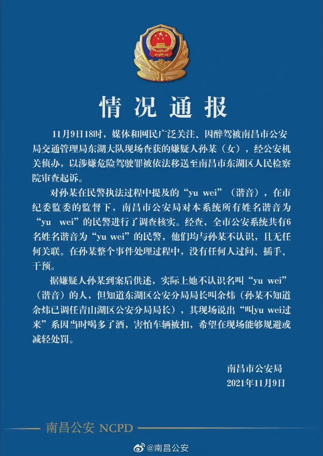 @南昌公安 刚刚通报:在市纪委监委的监督下,南昌市公安局对本系统所有姓名谐音为“yuwei”的民警进行了调查核实。经查,全市公安系统共有6名姓名谐音为“yu wei”的民整,他们均与孙某不认识,且无任何关联。在孙某整个事件处理过程中,没有任何人过问、插手、干预。