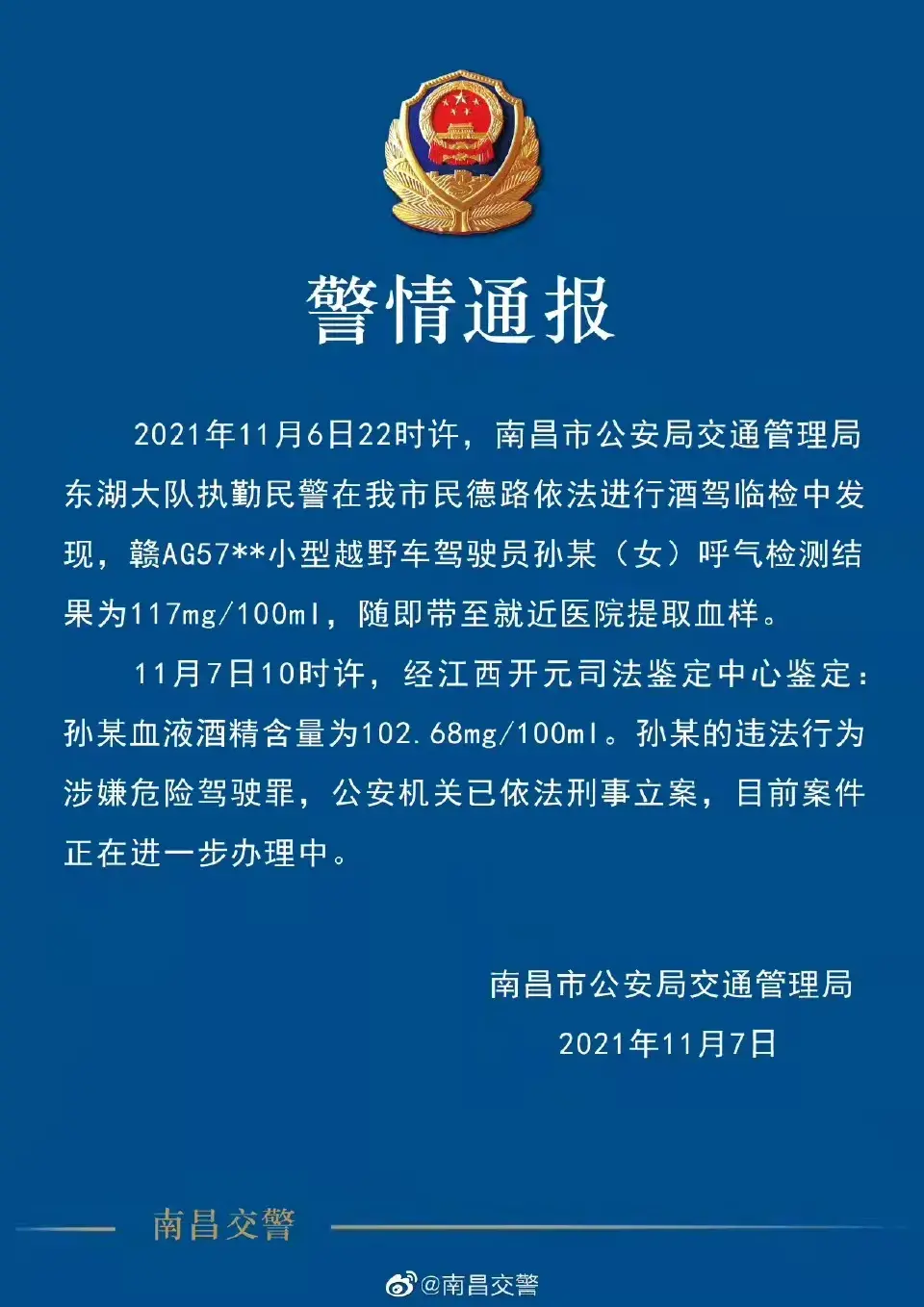 @南昌交警 7日通报,孙某涉嫌危险驾驶罪,已被刑事立案。