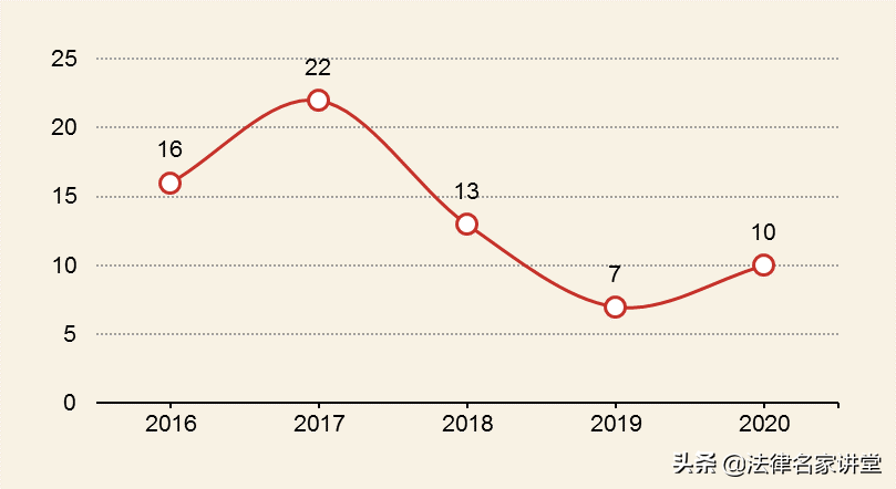 从图中可以看到,2016和2017年的案件最多,从2018年以来有所下降,但近年来一直维持在10件左右的水平。