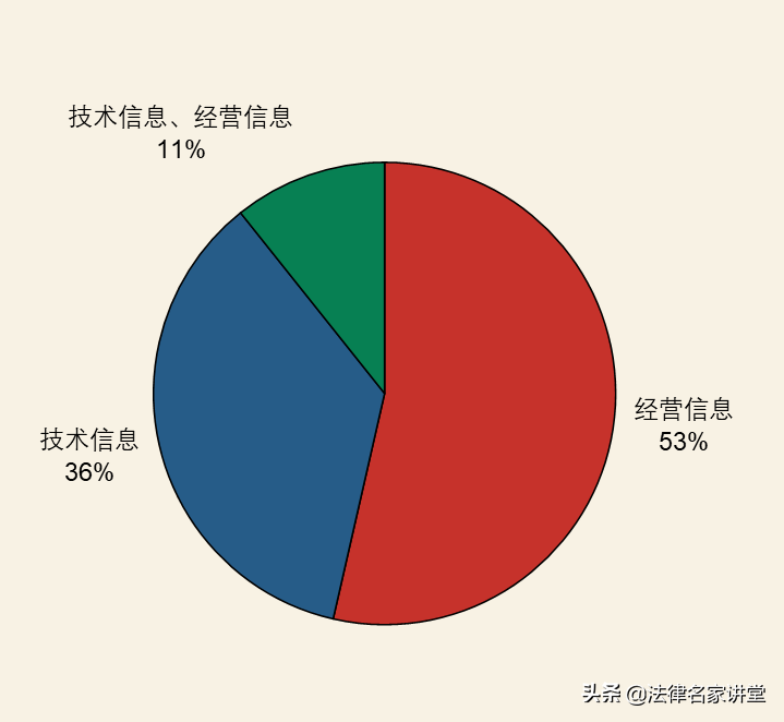 68起案件中,处罚书中注明了侵犯秘密类型的共有56起,其中仅涉及技术信息的有20起,占36%,经营信息的30起,占53%,二者兼有的为6起,占11%。