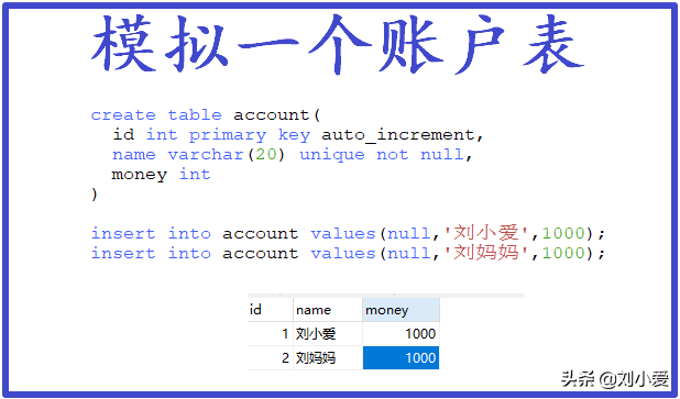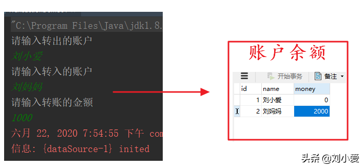 刘小爱账户给刘妈妈账户转1000刘小爱账户余额减少1000刘妈妈账户余额增加1000根据代码可拓展性原则,并未将账户名,转账金额写死。