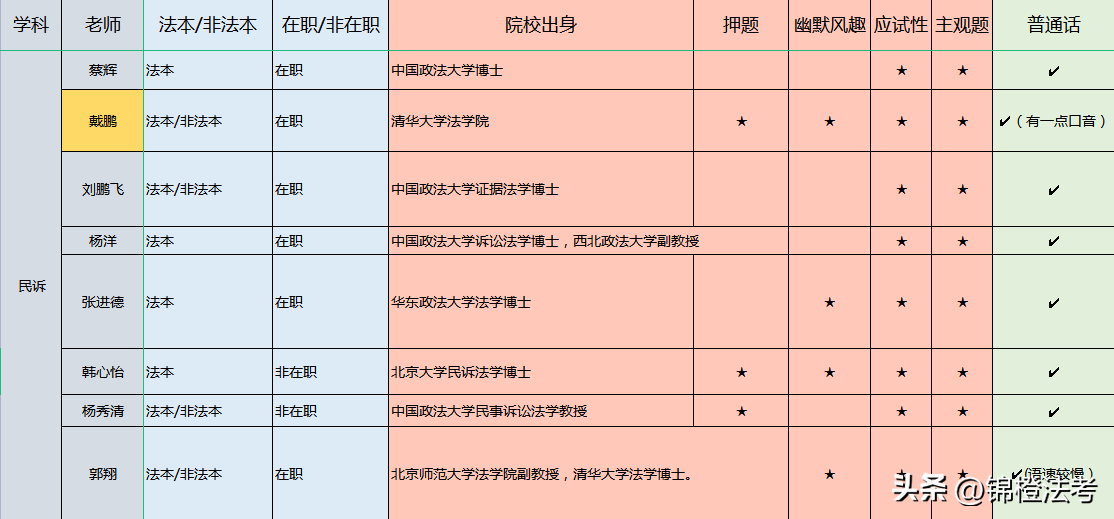 戴鹏毕业于清华大学法学院,属于法考技术流讲师,比较适合零基础的在职考生。戴鹏老师在进入法考培训领域的时候非常年轻,在初期被轻视中凭实力逐渐证明了自己。他授课特别注重民诉法本身的命题规律与特点,能够将较为枯燥的法条以及难以理解的原理通过案例或者故事的方式讲的极为透彻,授课风格比较幽默,又能紧扣命题特点,注重考生案例分析的能力提升以及解题技巧的训练,深受考生欢迎,浓眉大眼的他被考生爱称为“戴小新”。他的讲义比较薄,内容也精炼,总结的干货基本能够当场消化吸收,因此橙子在这里建议大家选择民诉老师时,优先选择戴鹏老师。