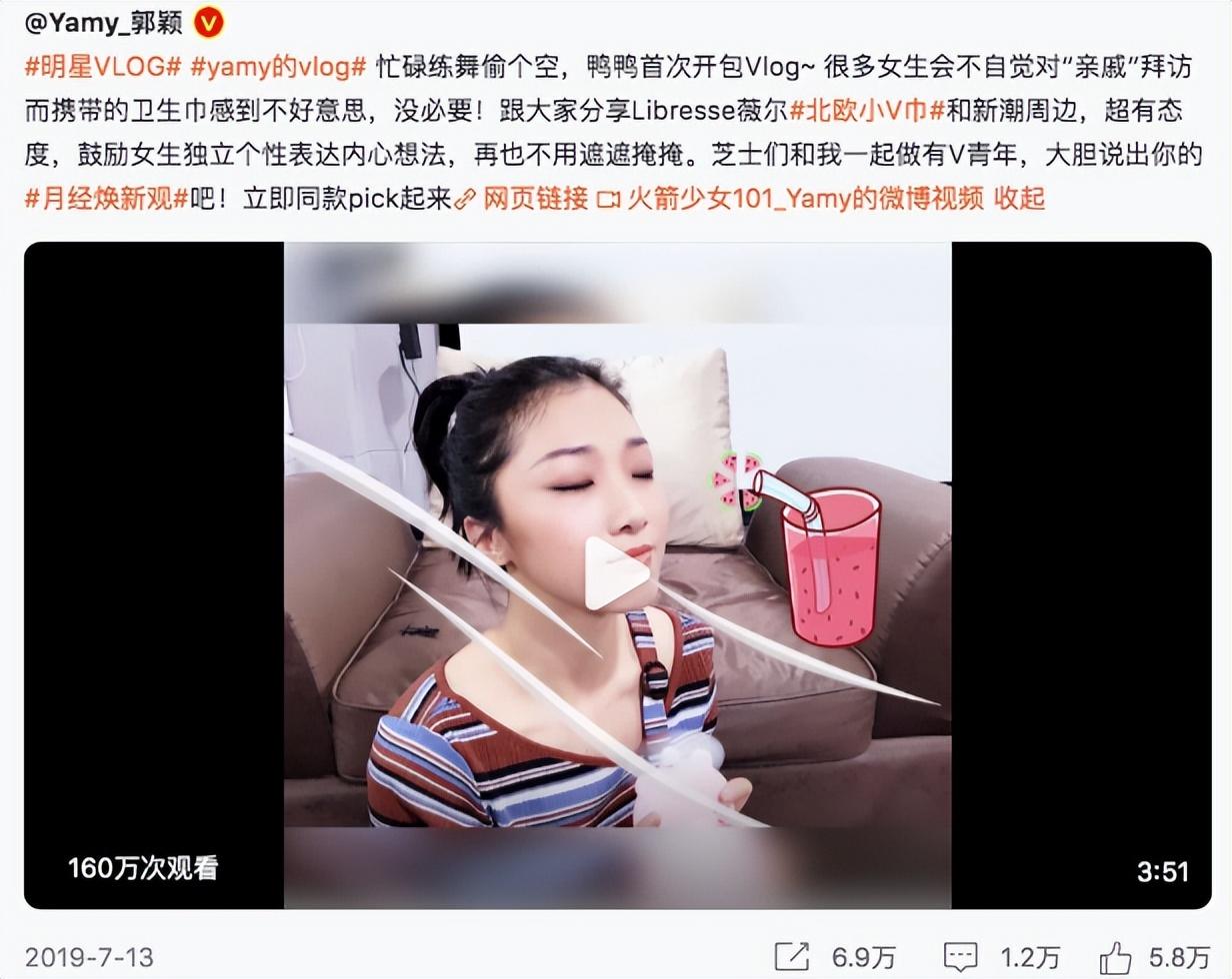 此外,薇尔还在国内社交媒体平台发起了两次品牌活动,联合火箭少女团员Yamy、头部账号视觉志的月经焕新观活动,由多位女性博主以明星产品“小v巾”为画板共创的“女生没有蓝色血液”活动,鼓励女性公开谈论月经。