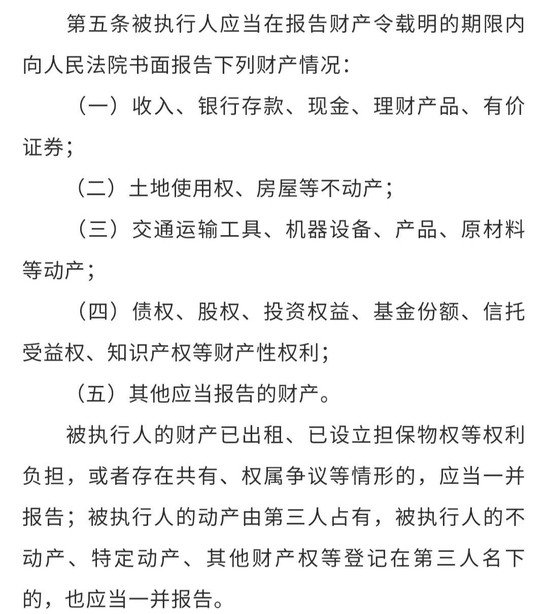 其实,他们就是违反财产报告制度。不要讲说我不懂法律,理解不了这么多制度。那么,法院传唤你过来,你为什么不按照程序的要求走呢?下图,就是需要报告财产的范围: