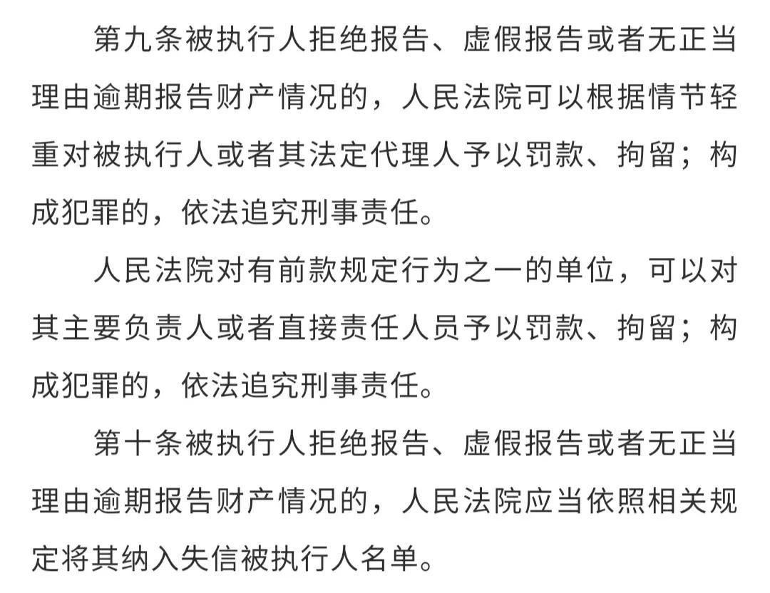 如上图,根据《最高人民法院关于民事执行中财产调查若干问题的规定》第九条、第十条之规定,违反财产报告制度拘留你绝对没商量。