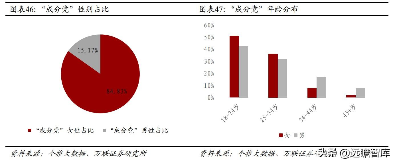 “成分党”的规模在不断壮大,“95后”、女性、高消费人群是“成分党”的主力军。根据个推大数据显示,“成分党”中有84.8%是女性,男性占比为15.17%;从年龄分布来看,“成分党”中有50%左右是18-24岁的“95后”;从消费水平来看,“成分党”中高消费群体占比约为50%。