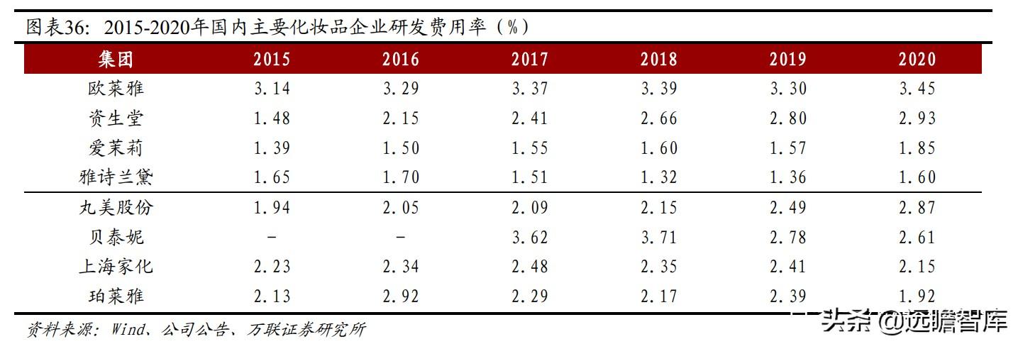 从研发费用率来看,国内外美妆企业的研发费用率大体维持在1.5%-3.5%之间,其中欧莱雅从2015年的3.14%提升至2020年的3.45%,位居各集团之首;国内美妆集团中,2020年,丸美股份、贝泰妮的研发费用率分别为2.87%、2.61%,位列第一和第二。