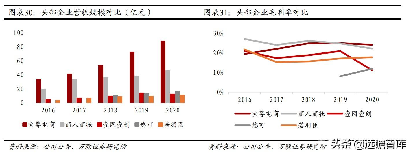 而随着线上平台渠道逐渐丰富,营销方式日渐创新,线上运营的难度也随之提高,对服务商运营效率提出更高要求,精细化、专业化趋势显著。头部玩家的运营团队设置更为专业,规模大且资金较为充足,能够更快地调整运营策略、向外布局新渠道以适应行业转型需求;而中小服务商营销资源较为缺乏、多渠道布局能力较弱,行业转型下调整难度加大。预计随着行业转型深入会加速中小服务商的清场,头部玩家如宝尊电商、丽人丽妆、壹网壹创、悠可等的优势将凸显,市场集中度将加速提升。
