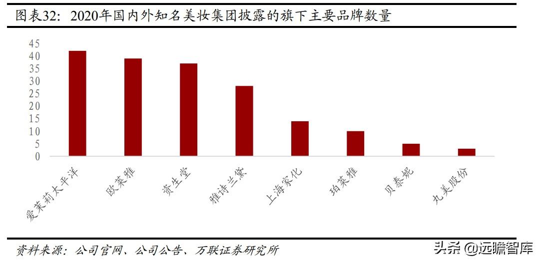 以国际头部美妆集团为例,目前均以集团的形式经营,旗下拥有众多品牌,例如爱茉莉太平洋、欧莱雅、资生堂旗下品牌数量均超过35个。