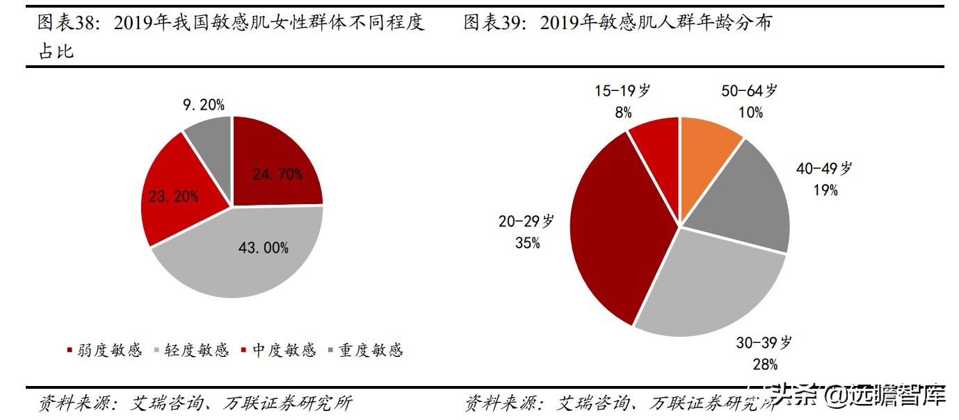 根据艾瑞咨询的数据显示,2019年我国敏感肌女性群体中,中度以上敏感肌群体占比为32.4%,轻度敏感肌群体占比为43%。以年龄层次划分,30岁以下的年轻群体占比达到43%。国人敏感肌护肤意识逐渐增强,我国皮肤学级护肤品市场规模快速增长,对标欧美等发达国家还有巨大提升空间。