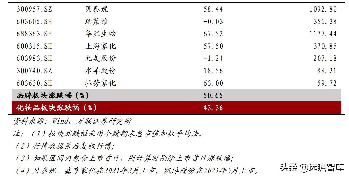 我们化妆品产业链中选取了一批化妆品业务收入占比较大的A股上市公司,包括科思 股份、青松股份、嘉亨家化、壹网壹创、丽人丽妆、凯淳股份、若羽臣、贝泰妮、珀 莱雅、华熙生物、上海家化、丸美股份、水羊股份、拉芳家化共14支个股组成化妆品 板块(下同),以便更清晰地探讨该板块以及相关个股在市场中的表现。