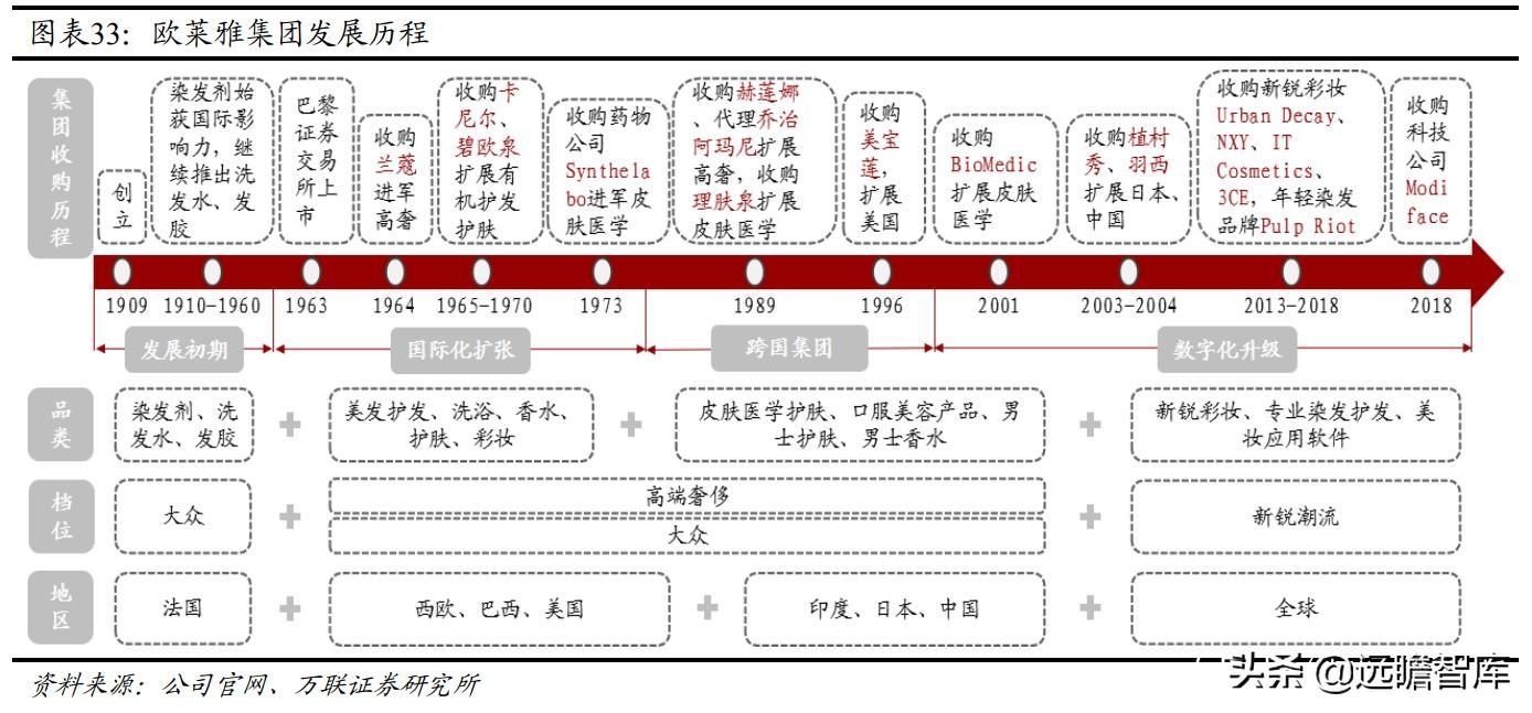 欧莱雅前身于1909年成立,凭借年轻的化学家欧仁·舒莱尔发明的染发剂配方,初获国际影响力。1963年欧莱雅登陆巴黎证券交易所,在获得资本补充后,集团收购开始加速。我们从品类、品牌档位、渠道三个方面来观察欧莱雅的收购逻辑。