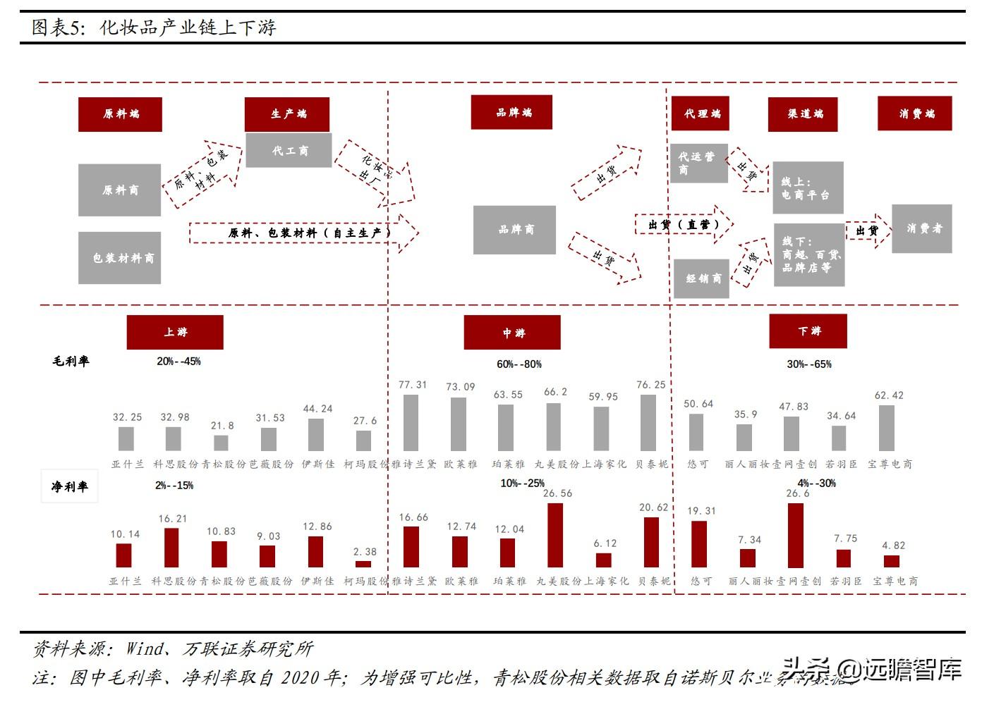 化妆品原料包括水、甘油、乳化剂、稳定剂、油脂、香精等;包装材料包括纸包装、塑料包装、玻璃包装等。原料及包装材料价格的波动会对原料端和生产端的企业的毛利率带来一定的影响。化妆品生产端的企业主要是从原料生产商与包装材料生产商处采购原料和包装,并进行化妆品的加工。生产端企业主要采取自行生产和代工生产两种模式。少数化妆品公司具有独立生产线,可以自主研发化妆品,而大部分的化妆品公司则采取代工模式,委托代工厂生产成品。代工企业被夹在原料商和品牌商之间,对上下游的议价能力较低,毛利率在30%左右,净利率为2%-15%。