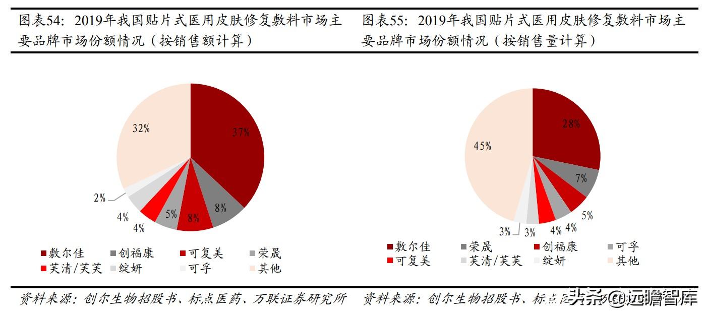 据创尔生物的招股书显示,医用皮肤修复敷料可以分为贴片式和非贴片式两大类,其中贴片式是主流,更加适用于皮肤修复。我国贴片式医用皮肤修复敷料消费量从2017年的1.61亿片提升至2019年的3.37亿片,CAGR高达44.6%。且该市场集中度高,市占率(按销售额计算)排名前7的品牌占据了全市场接近70%的份额,包括敷尔佳、创福康、可复美、荣晟、芙清、绽妍、可孚。