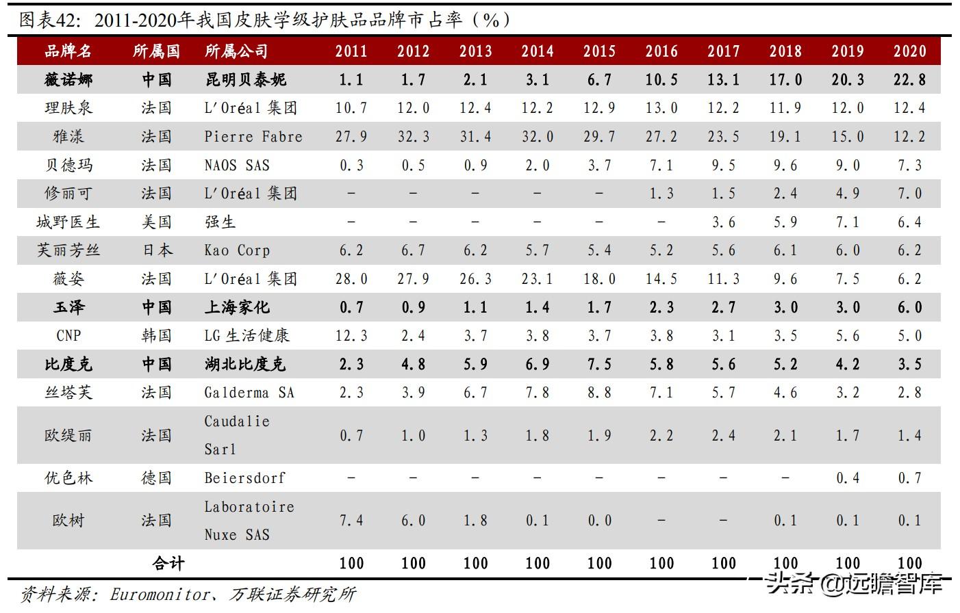 1)皮肤学级护肤品赛道:贝泰妮旗下薇诺娜、上海家化旗下玉泽均依靠强研发、医生背书以及快速占据药房、日化专营店、电商等渠道占领市场,形成了较强的研发和渠道壁垒。