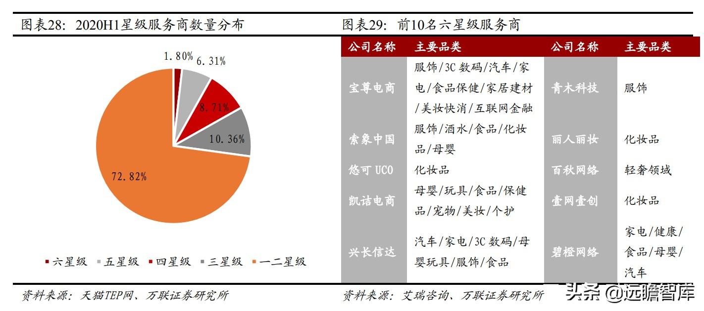 代运营市场入行门槛低,近年来代运营企业数量随着网购经济的发展而不断增加。根据《中国电商服务业发展报告》显示,2020年上半年,国内代运营服务商数量达到 8.9万家,经天猫平台认证的仅1086家,六星级服务商仅12家,其中,宝尊电商、索象中国、悠可UCO三家则主导了45%的电商营收业绩。
