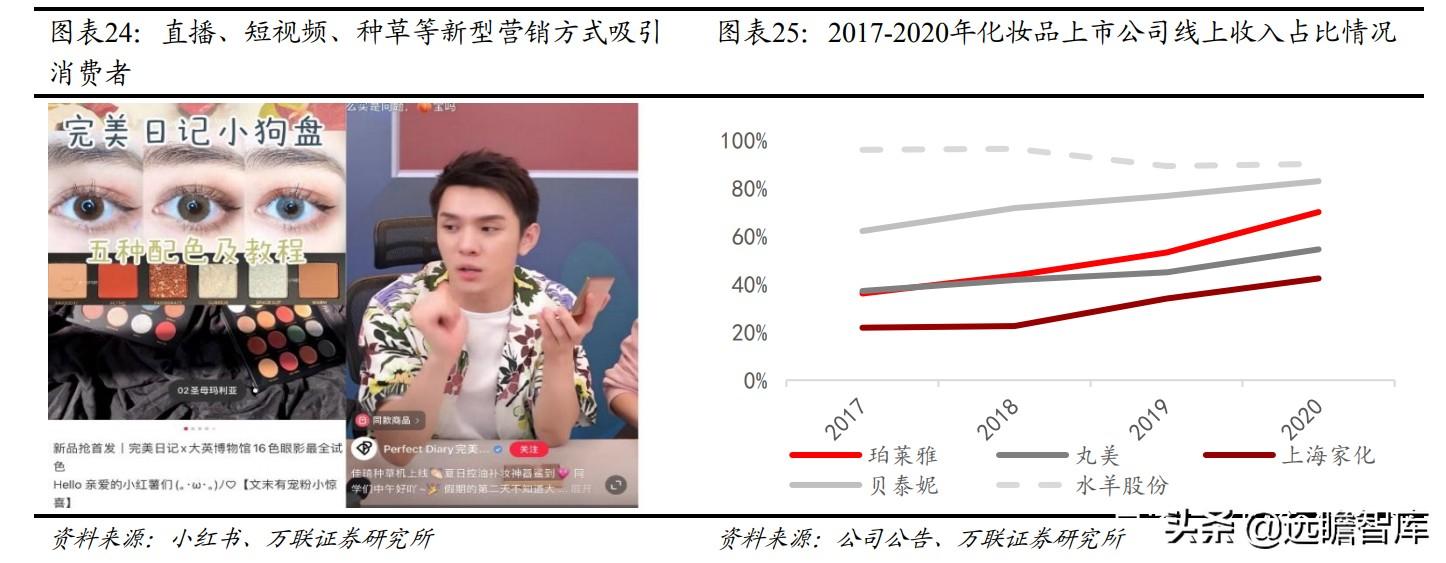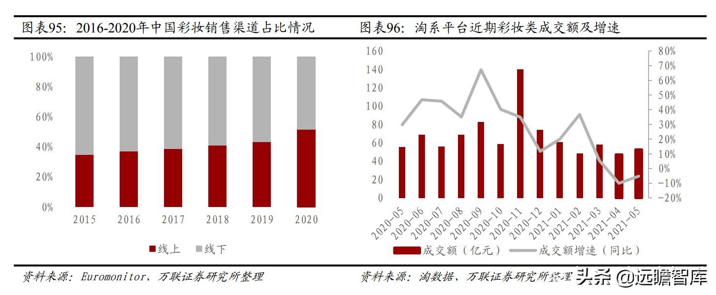 线上成本优势+新兴社媒平台的引流,美妆消费从线下往线上转移。