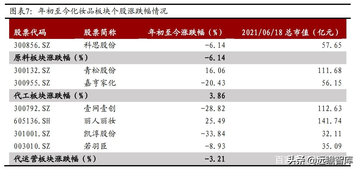 年初至今,由于华熙生物、拉芳家化、上海家化、贝泰妮涨幅较大,品牌板块共计上 涨50.65%,位列四个子板块中第一。原料板块和代运营板块分别下跌6.14%和3.21%,其中,代运营板块中,丽人丽妆表现较好,原料板块中的科思股份则表现相对较弱。代工板块上涨3.86%,其中青松股份表现尚佳。