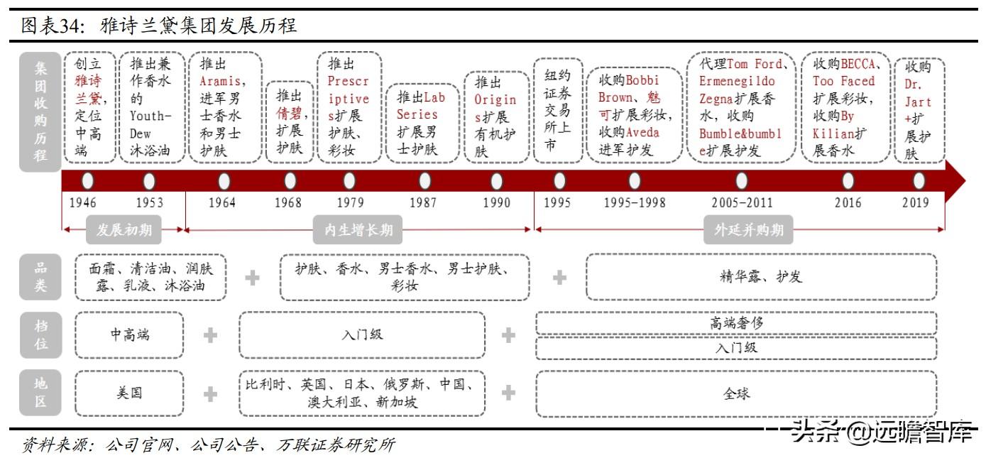 案例②:雅诗兰黛——初创定位中高端,此后通过“内生+外延”成长为美妆巨头