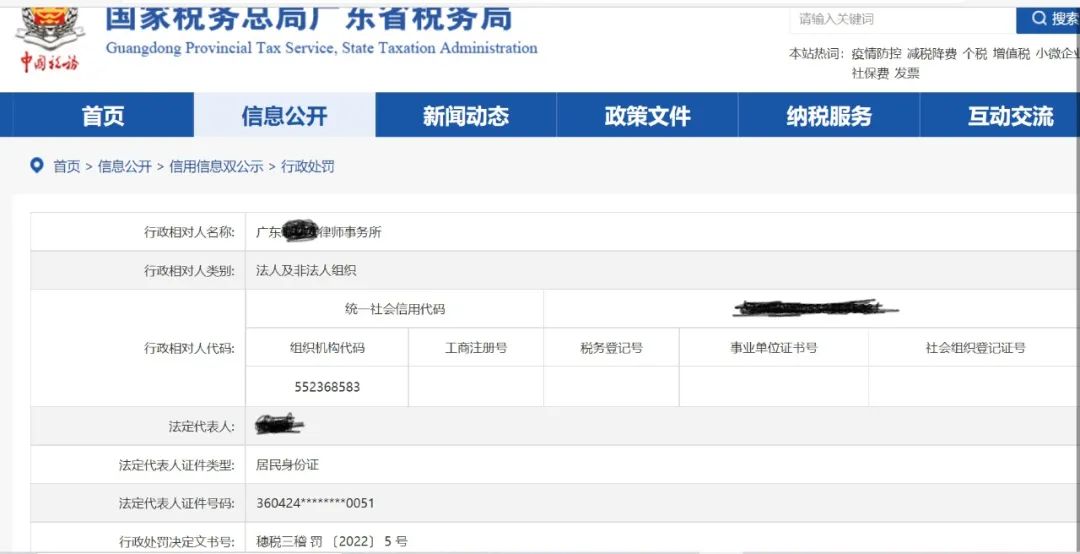 国家税务总局广州市税务局第三稽查局于2022年2月15日对广东XX安律师事务所(合伙所)做出《税务行政处罚决定书》,针对律师私自收入等未开票收入和律所未代扣律师的个人所得税进行行政处罚。如下图所示: