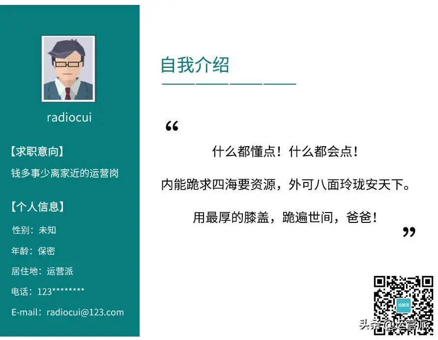 版权声明:我们致力于保护作者版权,注重分享,被刊用文章【优秀简历案例(这些运营人的简历太绝了)】因无法核实真实出处,未能及时与作者取得联系,或有版权异议的,请联系管理员,我们会立即处理! 部分文章是来自自研大数据AI进行生成,内容摘自(百度百科,百度知道,头条百科,中国民法典,刑法,牛津词典,新华词典,汉语词典,国家院校,科普平台)等数据,内容仅供学习参考,不准确地方联系删除处理!;
