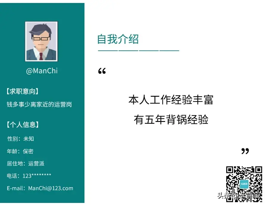 第一份简历来自@ManChi,是一位典型的“专家运营”,5年的运营工作种,只专注于“背锅”这一项技能,相信5年的时间,该应聘者已经把一项工作做到极致。