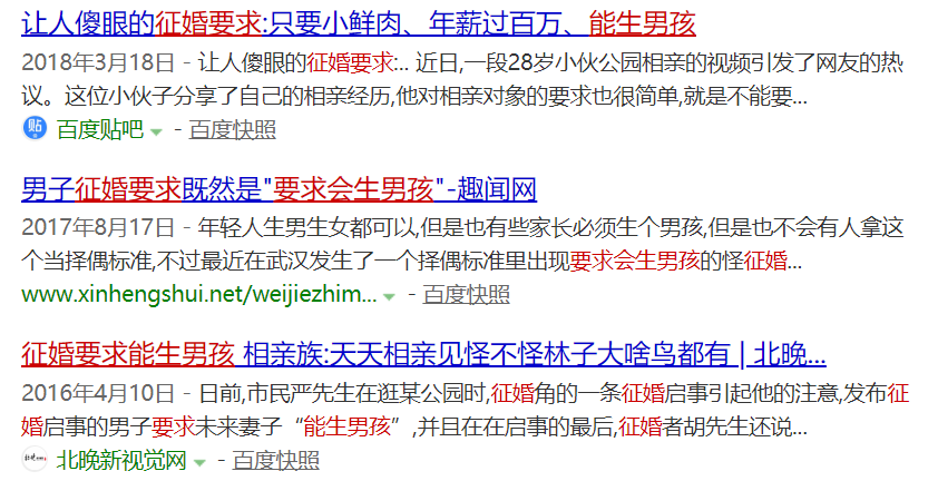 天眼妹甚至还看到过很多征婚要求能生男孩的新闻,也是让人大跌眼镜。