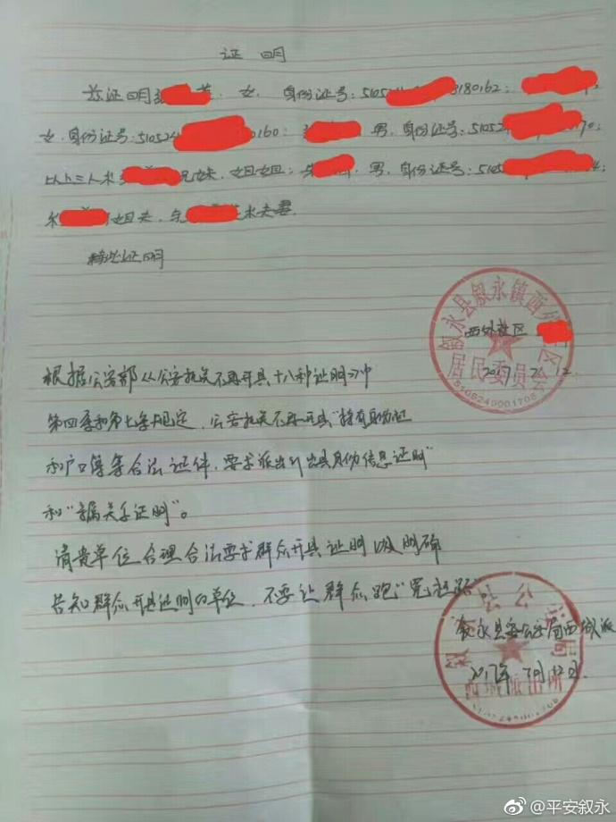 7月12日,叙永镇西外社区群众到省外探监,被要求到户籍地派出所开具亲属证明。社区民警协调后由西外社区居委会开具了亲属证明,民警在证明下方备注文字并落款盖章。