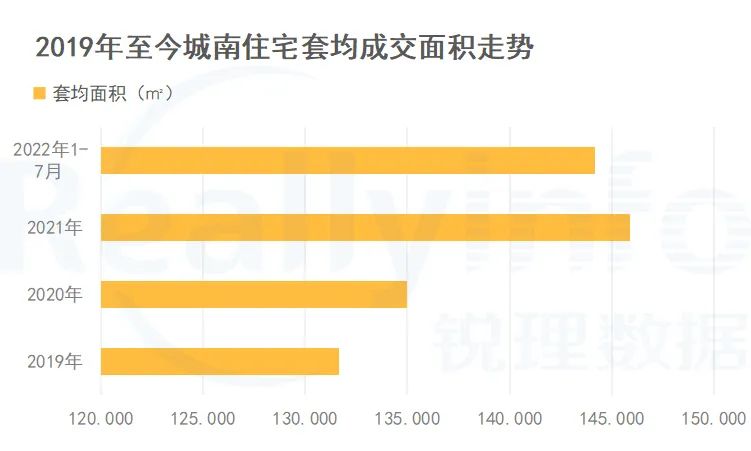 第二步,锁定130-150㎡畅销面积段。锐理数据RAP系统显示,从2020年开始城南住宅所有面积段中,130-150㎡面积段的供应和成交套数占比最多,且有持续增大的趋势。2022年1-7月,城南住宅130-150㎡房源新增6131套,销售8001套,供销比仅0.77,还有较大的市场缺口。
