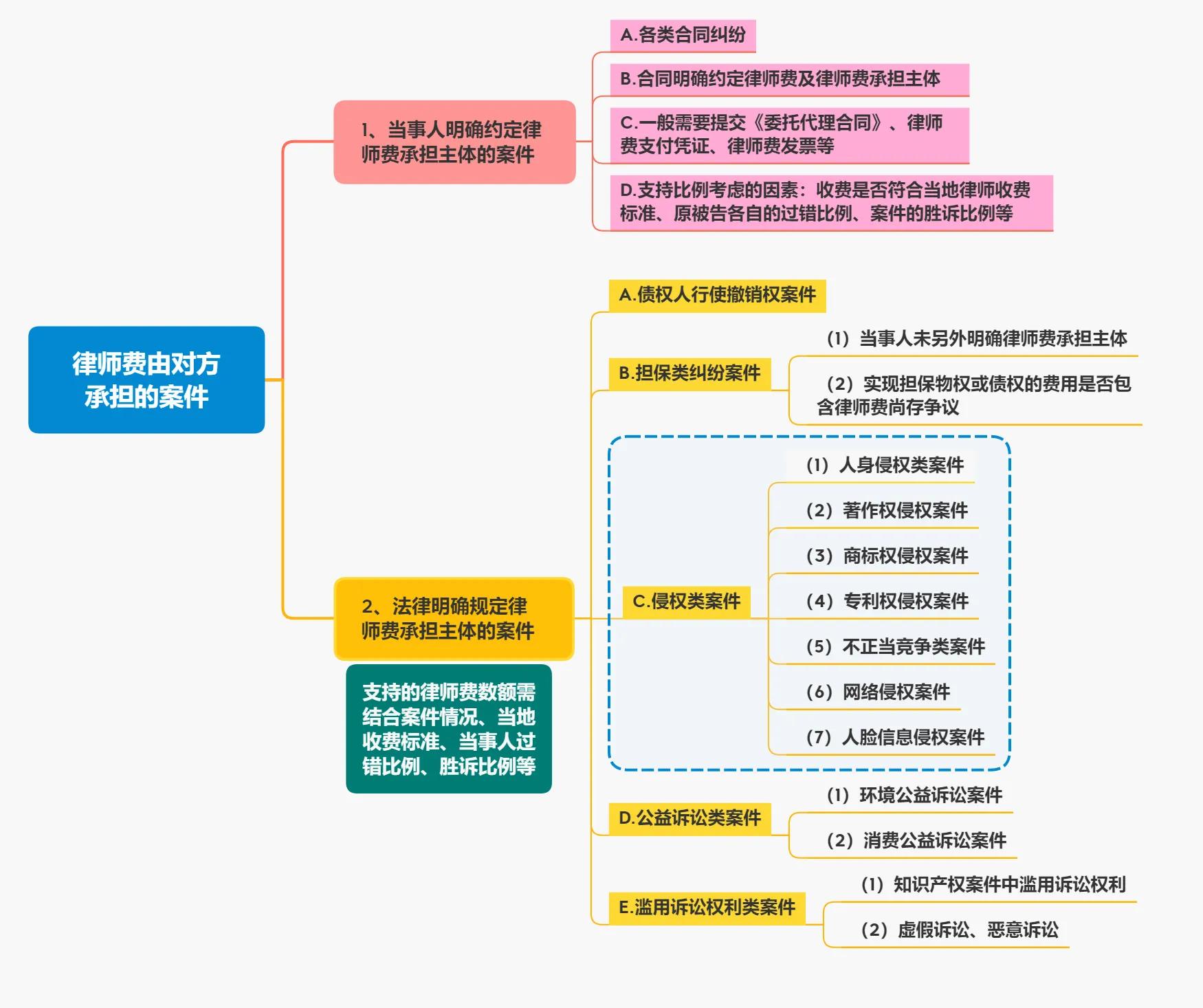 根据前文分析,民事案件中可以要求对方承担律师费主要包括以下几类:(1)起诉对象为合同相对方,合同中明确约定了律师费由对方承担;(2)起诉对象为侵权主体,己方为维护己方权利支付的合理律师费;(3)起诉对象为存在严重过错的主体,如滥用诉讼权利的主体;(4)其他特殊案件。
