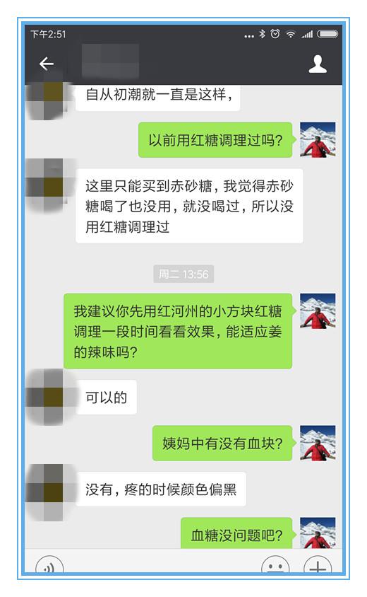 在征得J同学同意,在隐去名字、头像的情况小,把她的用红糖调经的过程分享出来,估计会帮到有同类“姨妈”问题的在校女大学时,感谢J同学的无私分享。