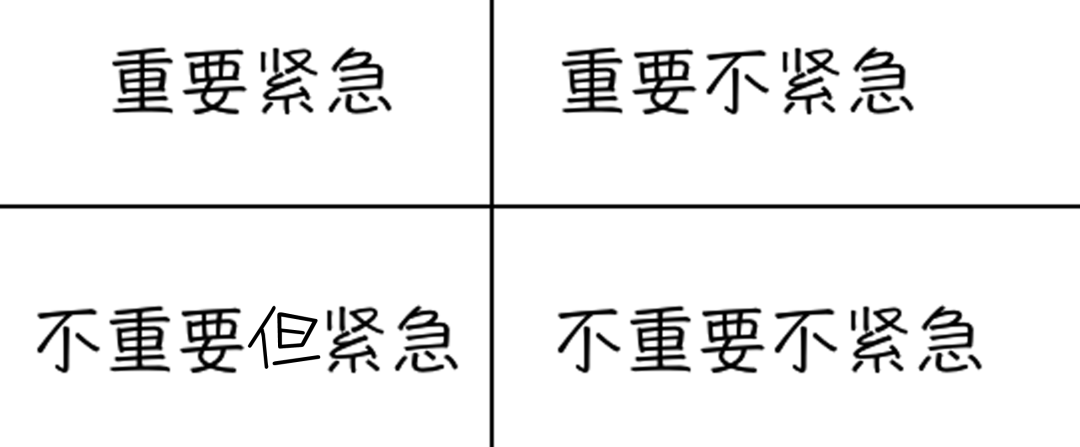 在时间管理中,非常流行的一种任务分类法即四象限图法,把所有的任务按照以下四种分类: