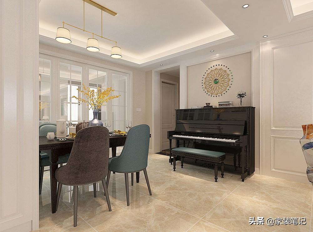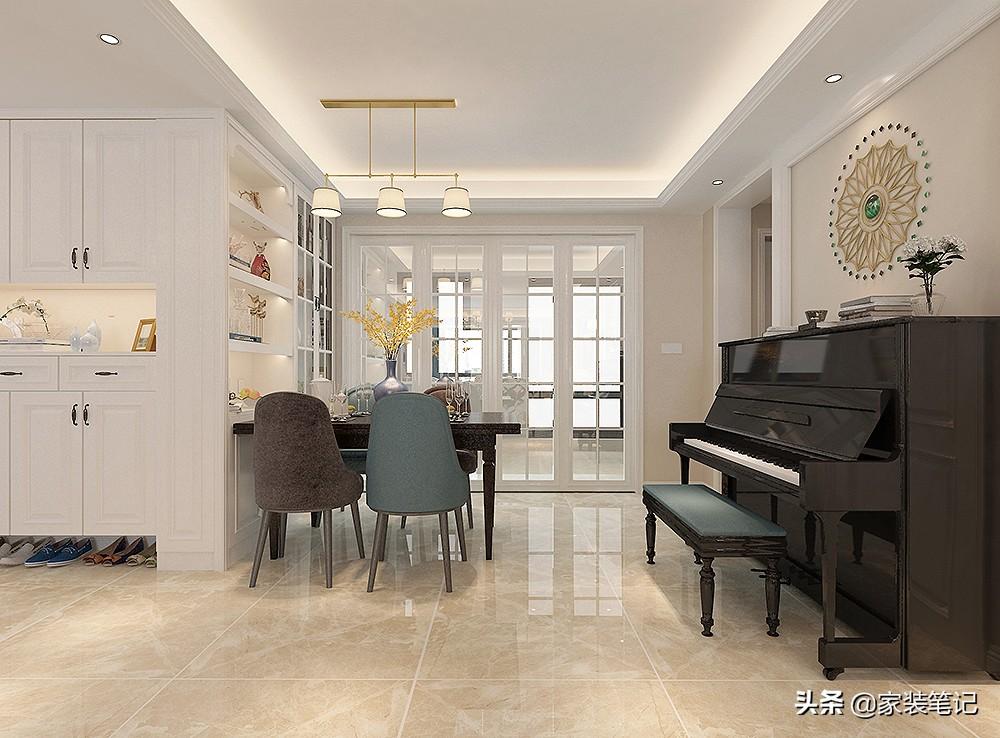 餐厅虽然面积不大,但是布置合理,连接着玄关区域,还摆放了一台钢琴,餐桌靠酒柜摆放,给餐厅的过道留出足够的空间出来。平时在这里可以在等待吃饭的时候还能弹弹钢琴,让每秒的音乐响彻整个家,让家洋溢着幸福的味道。当然如果家里面有钢琴,顶面一定要做好防噪音的处理,要不然吵到邻里了,就只能等着被投诉了。