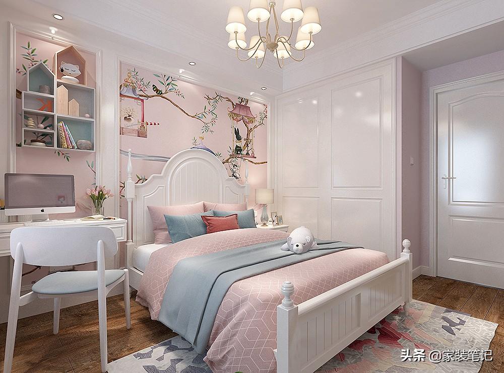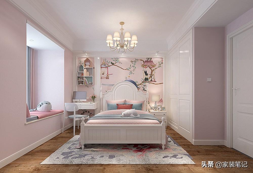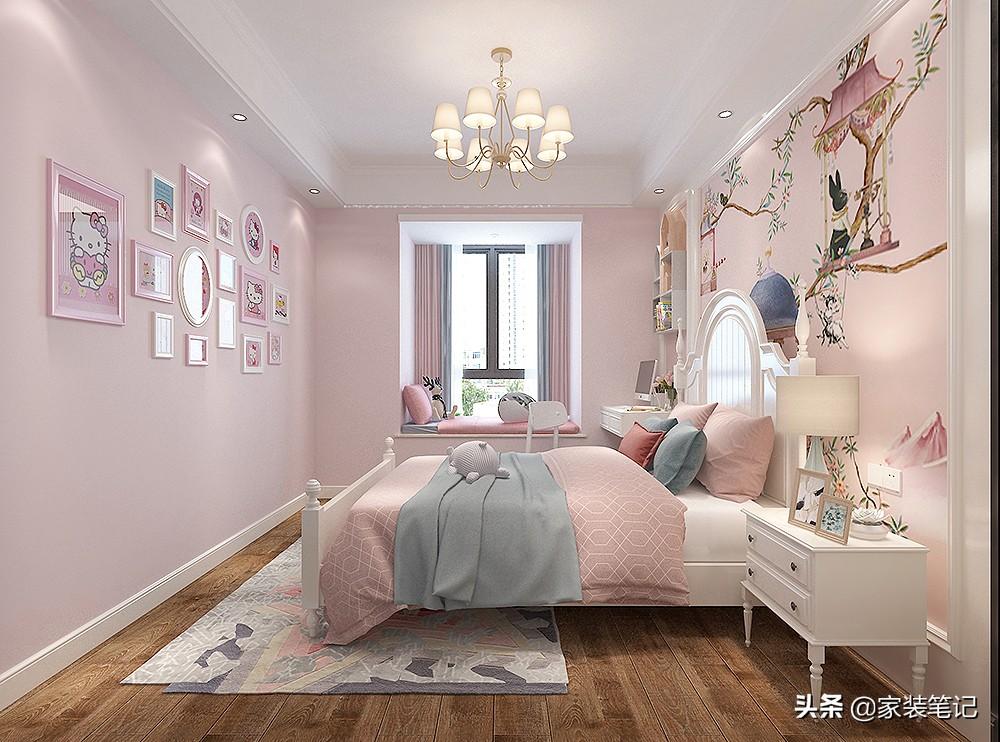 儿童房在色彩和空间搭配上,采用了明亮、轻松的颜色,对比色也会有不一样的效果。因为是女孩子所以颜色为粉红色为主色调,受面积影响衣柜没有办法做平开门,而是选择的推拉门,顶面简单地吊了一圈边顶,床头顶面嵌入了几盏射灯。