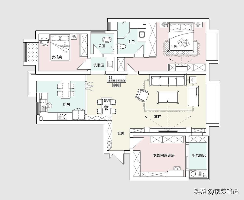 经过精心的户型格局布置之后,解决户型的弊端,让动线更加通畅。之前厨房面积很小,所以把旁边的阳台纳入进来了,这样厨房就变得很大了,里面还做了吧台出来,这样平时只有两个人吃饭的时候就特别方便。公卫也利用之前的格局,做了很好的干湿分离的设计处理。卧室保留原有的三间,除了主卧室和女孩房之外还有一间衣帽间兼客房。
