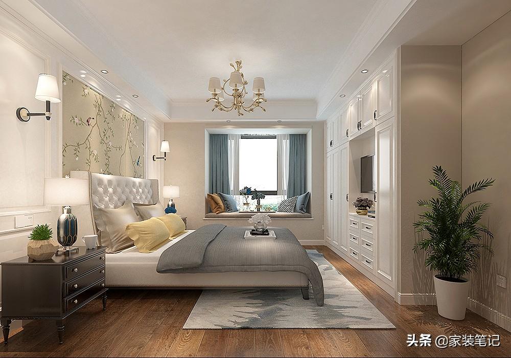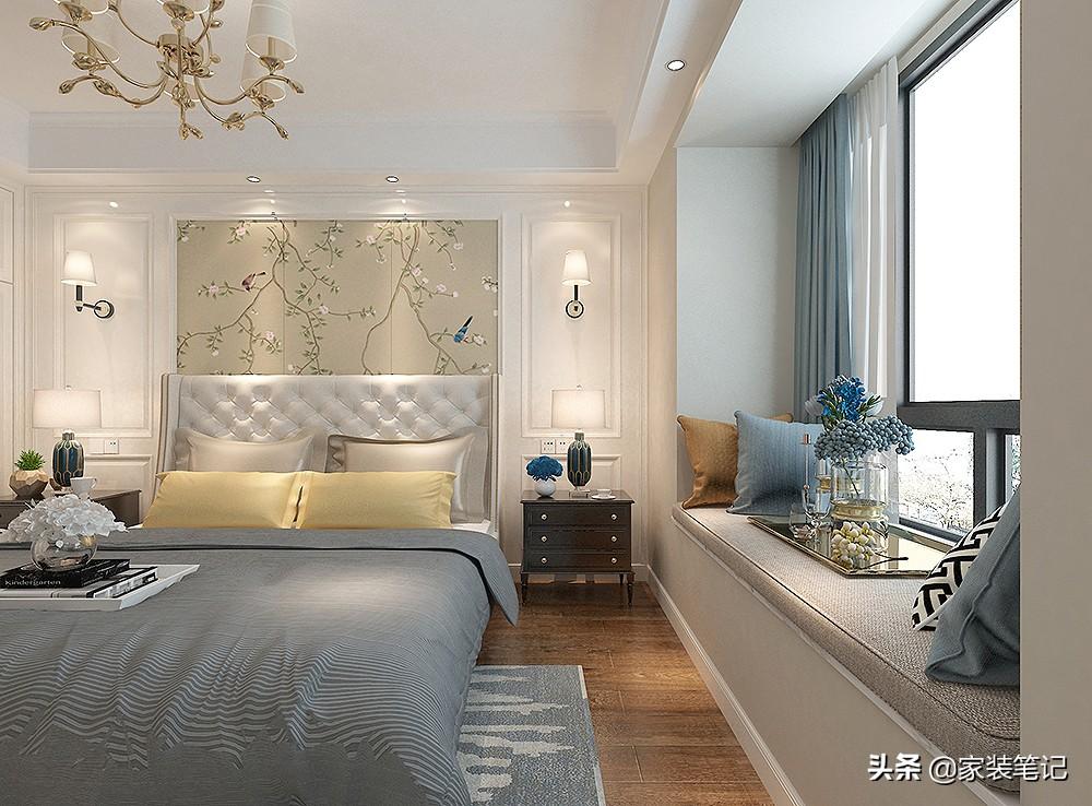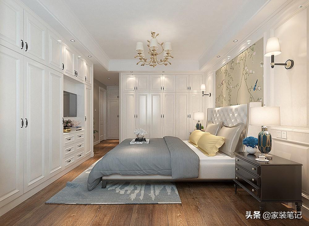 主卧室既有现代的时尚和前卫,也融合了美式本身的豪放和大气,不同特质的结合让卧室在尊重传统的基础上突破常规,彰显着它独特的魅力。主卧室的整体布置还是比较显温馨的,作为主人的私密空间,主要以功能性和实用舒适为主,吊顶采用简单的“双眼皮”造型,多用温馨柔软的成套布艺来装点。