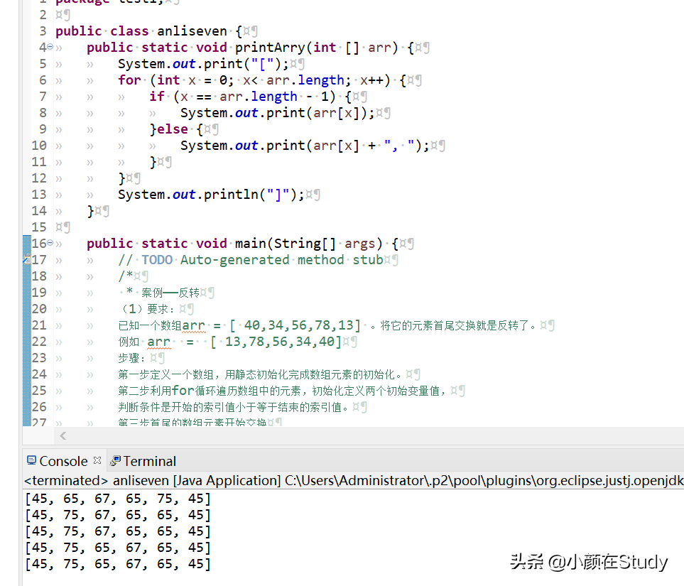 Java程序会有一个临时空间存储数据,第一个索引值0的数据放入到临时空间,然后将最后一个索引值的数据放到第一个。以此类推,直到最后一个。临时空间我们定义一个名字为:temp。